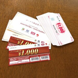 週末の午前中、アルと散歩途中にあるスーパーで楽天チェックを済ませようとサービスカウンター近くへ寄ったところ、お得なボーナス商品券パックの販売に関する掲示を発見!この土日2日間のみ販売され、商品券10,000円分(有効期限無し)を現金で購入すると1,000円分のプレミアム割引券(有効期限付き)がもらえるというものでした。つまり10,000円で11,000円分のお買い物が出来ます。
