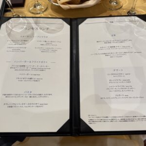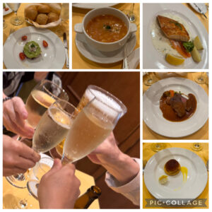 14階にあるビュッフェ形式のレストラン〝ホライゾンコート〟へ行ったものの空席が見当たらなかったため、6階メインダイニング〝インターナショナル・ダイニング〟へ。こちらはすぐに4人テーブル席へ案内してもらえました。スパークリングワインや赤ワインと共にアボカドと小エビのサラダや牛テンダーロイン肉のグリルをオーダー。デザートのリンゴのタルトタタンはホットコーヒーと一緒にいただきました。15ドル以下のアルコールが1日15杯まで無料等様々なサービスがセットになったプリンセスプラスを申し込んでいるので、乗船中の飲食はお店や商品にもよりますがだいたいどれも無料です。