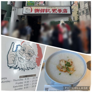 8:00過ぎ、朝粥を食べに『謝甜記 貳号店』へ。しばらく並んで入店。白粥、五目かゆ、ピータンかゆ等を注文。普通サイズが大きな丼サイズなのでお腹いっぱいになります。