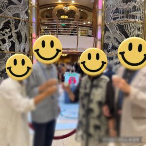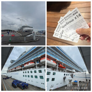 ホテルへ戻りひと休みした後、11:00にチェックアウト。歩いて横浜港大さん橋国際客船ターミナルへ。誘導に従い整理券をもらい、並べられた椅子に座って順番待ち。しばらくして手荷物検査と乗船手続きを済ませ、ルームキーにもなるコイン型の電子機器〝メダリオン〟を受け取り、11:45頃ダイヤモンド・プリンセスに乗船。