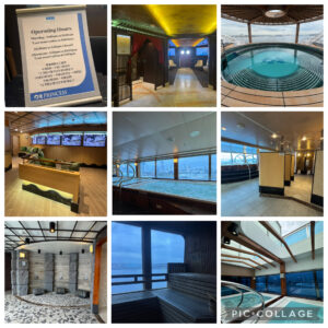 客室に入れるのは13:00以降のため、まずは15階の展望大浴場〝泉の湯〟受付へ行って、1人199ドルのクルーズパスを購入。基本〝泉の湯〟は予約制で1回券もしくは5回券を購入するのですが、クルーズパスを購入すると最終日以外、クルーズ中1日4回まで予約無しで利用できます。それとは別に本来有料の〝ロータススパ〟の男女共用アロマスチームサウナエリアも無料で利用できました。ネット情報では販売数に上限があるとのことだったので、乗船後すぐに買いに行きました。この日〝泉の湯〟の利用時間は16:00以降だったので見学だけして昼食へ。