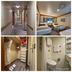食後、12階の客室に入ると数日前に宅配便で送っておいた大きなスーツケースが届いていました。アラフィフ夫婦とアルの両親の部屋は隣同士の内側窓無しツインルーム。トイレと洗面台はありますがバスタブは無くシャワーのみ。入浴は先程購入したクルーズパスで毎日〝泉の湯〟を利用しました。