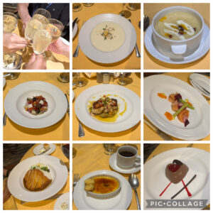 17:20、予約しておいた6階メインダイニング〝インターナショナル・ダイニング〟で夕食。外海に出たのか、この時から僅かに揺れを感じるようになりました。パイナップル&ココナッツ味の冷製ピニャコラーダスープやスズキの炙りパイナップルマンゴーサルサ等、一風変わった味付けの料理をチョイス。スパークリングワインや白ワインと共にいただきました。デザートはホットコーヒーとクリームブリュレ。お腹いっぱいでしたが、なんとか完食。