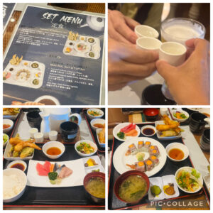 いったん部屋へ戻ってから、昼食を食べるため11:30頃7階和食レストラン〝海(KAI)寿司〟へ。本来は有料ですが、プリンセス・プラス特典でセットメニューを無料で食べることができます。ケイは白米が食べたかったのでお刺身と天ぷらのセット、アルと義父母はローストビーフの巻き寿司とお刺身、天ぷらのセットを注文。天ぷらというよりフリッターでしたが揚げたて熱々。お刺身は薄く、ご飯は柔らかすぎてがっかりしましたが無料なので文句は言えません。