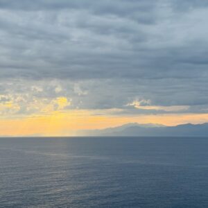 6:00、15階〝泉の湯〟で朝風呂の後、外のデッキに出ると雲の隙間から差し込む太陽の光と立山連峰の山並みが綺麗に見えました。