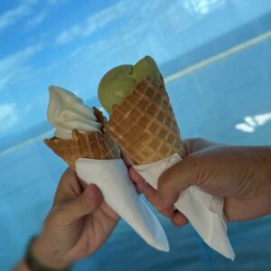15:00のおやつは14階プールサイドの〝アイスクリーム・バー〟へ。誰でも無料でもらえる抹茶アイスとバニラソフトクリームをアルとシェア。コーヒーが欲しくなる甘さです。