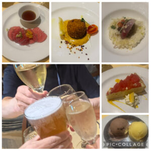 夕食は17:20から6階メインダイニング〝インターナショナル・ダイニング〟のいつもの席へ。ケイのの選んだ牛のタタキやクラブケーキ、チーズリゾット、グレープフルーツのタルトはどれも美味!スパークリングワインと合わせて美味しくいただきました。