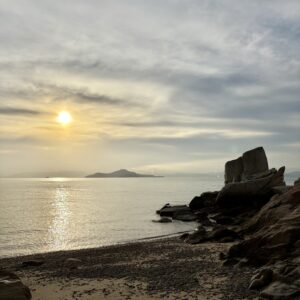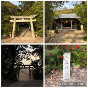 車に戻り山を下り、海岸線へ。入鹿海岸を海岸線に沿って歩いていくと奥に『入鹿明神社』が見えてきます。夕日が綺麗に見える場所で、ちょうど西日が差し込み始めていました。