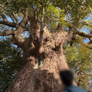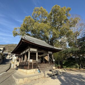 車に戻り、海岸沿いをドライブ。途中、沖美町公衆トイレにお世話になり、そこから歩いて〝黄幡社(おうばんしゃ)の大楠〟を見に行きました。「江田島市文化財散策マップ」によると沖美町随一の巨木で、天然記念物に指定されています。