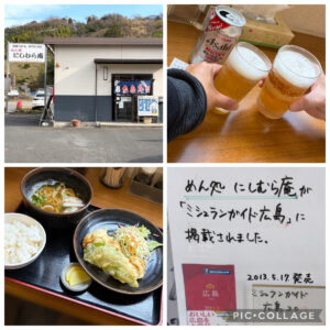 入浴後は道路を挟んで向かいにある『めん処にしむら庵』で遅めの昼食。揚げたて熱々の大きな牡蠣の天ぷら3個と大葉の天ぷら1個、キャベツの千切りサラダ、ミニうどん、ご飯、たくあんがセットになったカキ天定食をいただきました。柔らかめのもちっとしたうどんもスープのお出汁も美味しかったです。