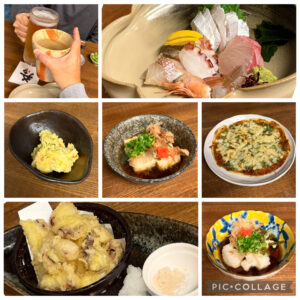 昨日とは別の地元スーパーで朝食用のパンを購入した後、『島の台所 旬彩』で夕食。お刺身盛合せやタコの天ぷら、揚げ餅などをいただきました。
