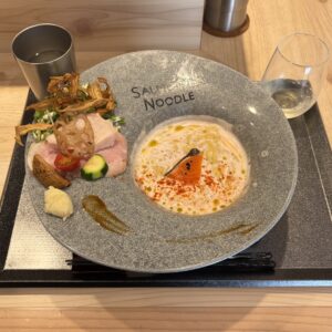 1日目、ほぼ定刻通りに羽田空港に到着。京急→JR→東急と乗り継ぎ、13:00頃三軒茶屋駅近くのフレンチラーメンのお店『サーモンnoodle三軒茶屋』へ。サーモントリュフラーメンは平打ち生パスタのようでクリーミーなソースにピッタリ。低温調理チャーシューや素揚げのゴボウやレンコン等、お洒落な器に添えられたこだわりのトッピングと組合せながら、よく冷えた白ワインと共に美味しく完食。