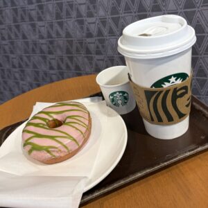 食後は近くの『スターバックス三軒茶屋店』へ。以前利用した新幹線こだまのプランでもらったドリンクチケットでホットコーヒーを注文。食後のデザートに桜抹茶ドーナツも購入し、2階席へ。