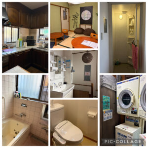 昔ながらの2階建ての民家をリフォームし、1階にキッチンや食堂、お風呂場、トイレ、ランドリールーム。2階にもトイレ2箇所、シャワールーム、洗面台があり、ドライヤーは洗面台の横に固定されていました。
