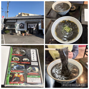 一般道を福岡方面へ向け走り続け、『官兵衛うどん』で遅めの昼食。オリジナルメニューの竹炭うどんにイカ墨を合わせたスープの〝くろだビックリうどん〟と〝かけ黒うどん〟を注文。どちらも麺もスープも美味しく完食。
