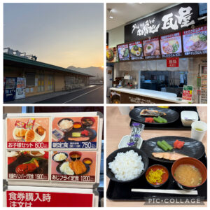 5日目7:00過ぎ、24時間営業の『美東サービスエリア』のフードコートで朝定食を食べてから自宅へ向け出発。