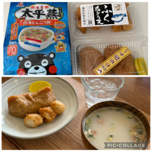 お昼前には無事自宅に到着。帰宅後の昼食は楽したいので、旅先で購入したもので済ませました。熊本名物〝太平燕(タイピーエン)〟のインスタント春雨スープ、天領日田鶏めし稲荷、ふくちぎり天。