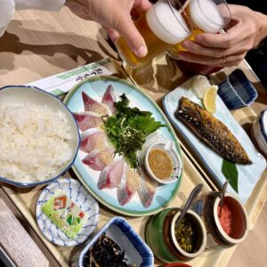 出発日当日のお昼頃、新幹線で博多駅に到着。しばらく和食を食べられなくなるため『博多の海鮮料理 喜水丸 博多一番街店』で昼食。ケイは博多ゴマサバ定食、アルはとろサバみりん焼き定食を注文し、サッポロ赤星の瓶ビールで乾杯。