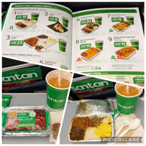 現地時刻20:20(日本と台北の時差1時間)、コタキナバルへ向け離陸。飛行時間は約3時間です。21:20頃、有料の機内食メニューからナシレマ(ご飯、鶏肉の煮込み、ピリ辛ソース、錦糸卵、ピーナッツ、小魚の素揚げ)とドリンクのセットを注文。CAさんは英語が通じますし、指差しでなんとかなりました。支払いはカードが使えず現金のみだったので千円札を2枚渡し、お釣りは現地通貨で10リンギット札1枚=日本円で約400円でした。