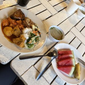 18:00頃、いったん戻って夕食タイム。チキンのカレー煮込みや魚の甘辛煮、焼きビーフンや野菜炒め等、ビュッフェ形式で美味しくいただきました。
