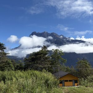 さらに車を走らせ、9:00頃キナバル村に到着。雲の上にキナバル山の山頂が見えました。お土産物や果物などを売っているお店がいくつかあり、ガイドさんがドリアンを買って振る舞ってくれました。大きな種のまわりのねっとりした白い部分を食べるのですが、思ったより食べた時の臭みや甘みは少なく、ニンニクのようなクセのある独特の風味がしました。