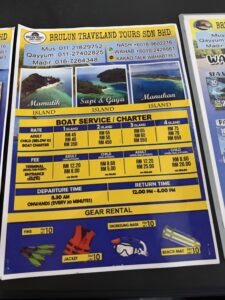 翌日は近くの離島へシュノーケリングへ出かける予定だったので、散歩がてら離島への乗船券売り場がある『ジェッセルトンポイント』へ。正規の乗船券売り場は閉まっていましたが、離島へのボートツアー会社のマレー人男性に声をかけられ、結局お願いすることにしました。サピ島までの往復乗船料金とターミナル利用料、ライフジャケットレンタル料込みの2人分で110リンギットと、事前に調べていた金額とほぼ同等でした。(入島料1人25リンギットは上陸する時に別途支払うため現金で用意しておきました。)