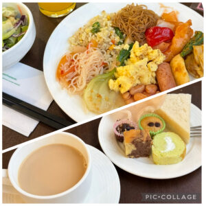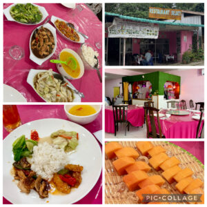 12時過ぎ、ポーリン温泉入口前のレストランに到着。テーブルごとにライスと4種類のおかず、卵入りコーンスープが提供され、取り分けていただきました。