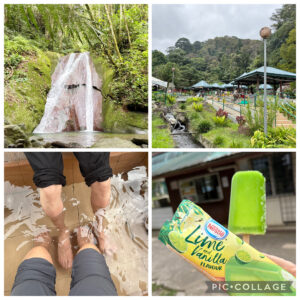 食後は20分程山道を歩いて滝を見学。その後、ポーリン温泉の足湯体験。熱湯とぬる湯の両方に入って足の疲れを癒した後、売店でライム&バニラのアイスを購入し木陰で食べてひと休み。